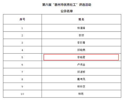 为总结提炼惠州市社会工作先进经验,鼓励社会工作实践活动,加强社工人才队伍建设。受惠州市民政局委托,惠州市社会工作者协会于2021年12月23-24日组织开展了第六届“惠州市优秀社工”暨第五届“惠州市优秀社工案例”评选活动。