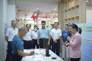 随后,调研组抵达龙丰街道长者照护之家,考察龙丰长者照护之家的医养、康养结合的养老服务体系、日间照护服务、居家养老服务、社区康复示范服务等运营情况及发挥的作用。在机构负责人钟英红的亲自讲解下,调研组听取了关于整个长者照护之家的PPT介绍及宣传视频,依次参观了中心的智慧养老展厅、书画室、手工作品义卖区、时光隧道展区、长者助餐点、康复训练区和康复理疗室、日间照料室、老年人能力评估室等区域配套设施。调研组针对中心采取的“公助民营”“场地换服务”的经营方式及所取得的成效表示高度的赞赏,对龙丰长者照护之家“一中心多站点”的专业化、多样化、市场化、标准化的社区居家养老服务给予了充分的肯定。